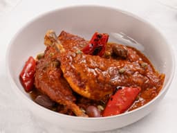 This Italian classic features large pieces of tender chicken thigh, baked in a rich and complex tomato sauce with capers, thyme, garlic, olives and bullhorn peppers, we then finish with fresh oregano and a sweet vinegar to add depth to this wonderful main dish. This goes fantastically with gnocchi, pasta or even just some crusty bread.
