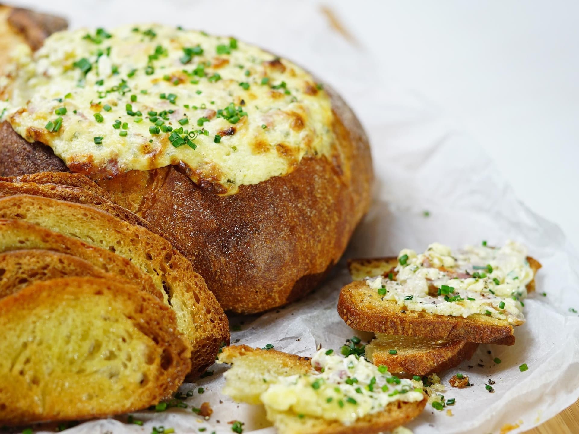 Classic pull apart Cobb loaf with creamy nacho cheese sauce, shredded chicken, corn & jalapeños topped with gratinated Mexican blend cheese