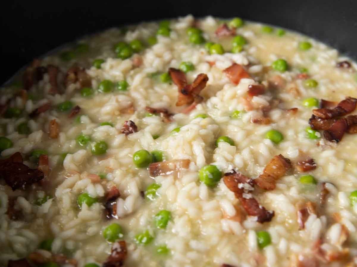 Creamy Arborio rice cooked slowly with our house chicken stock, sweet baby peas and crisp pancetta. Finished with butter and Parmesan for a rich, silky finish that feels like pure comfort in a bowl.