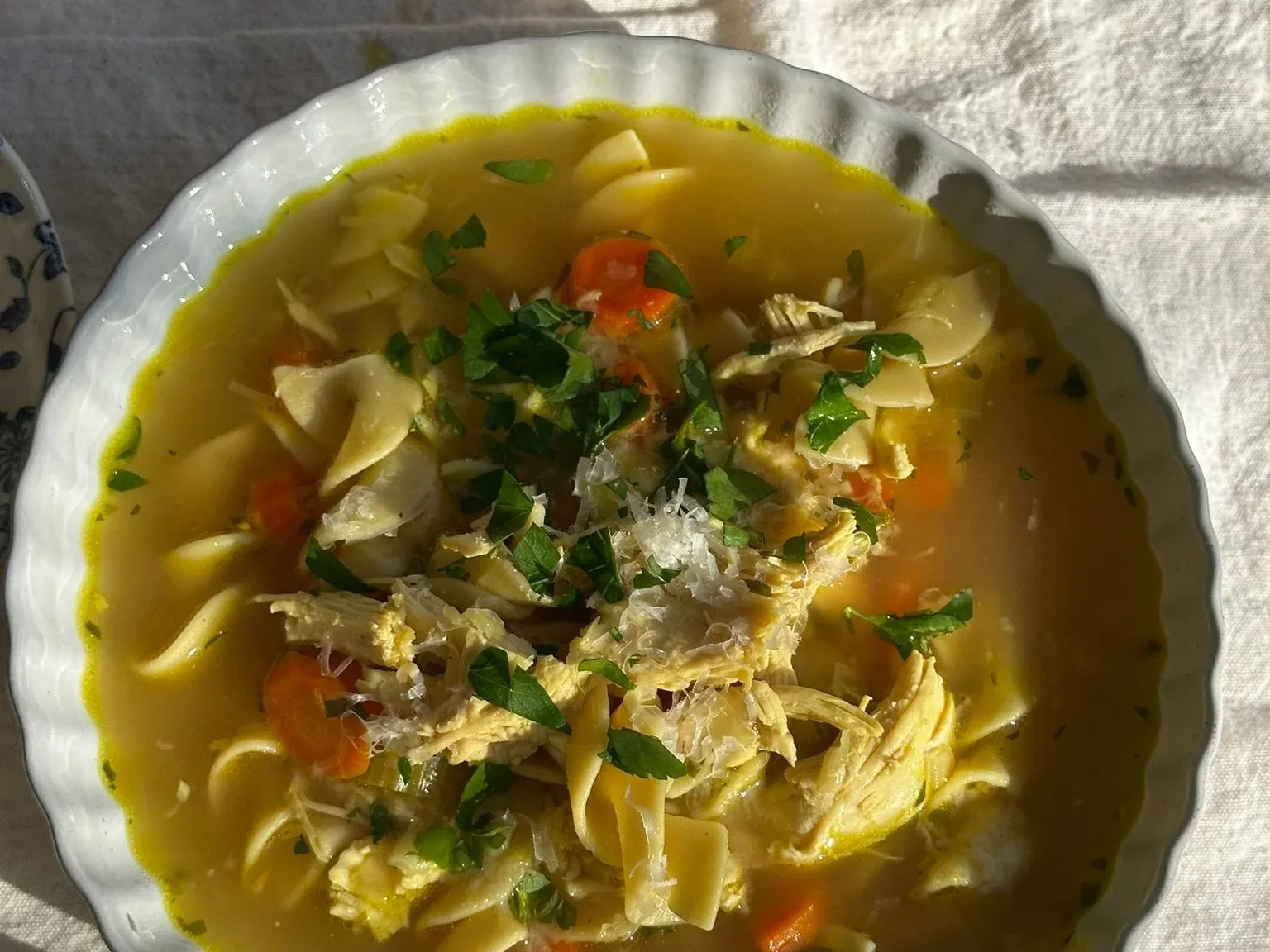 A feel-good classic made with free-range chicken, fresh vegetables, and our own Northside Grocer stock. Gently infused with ginger, turmeric, and lemon for a nourishing, golden broth — finished with tender egg noodles and fresh parsley.