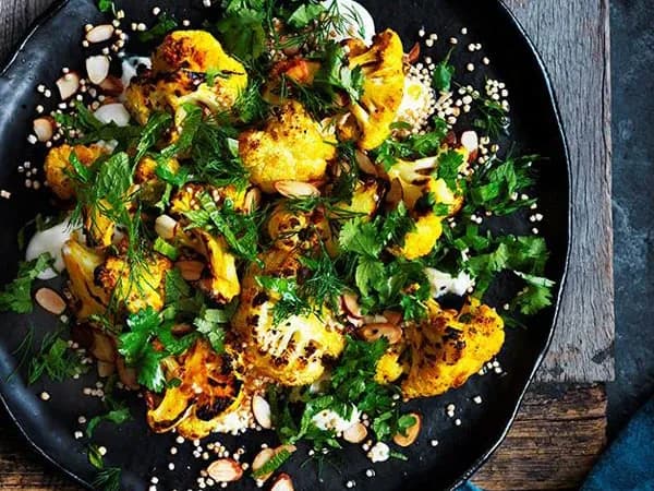 Cauliflower takes centre stage in this vibrant salad — roasted until golden, with edges that are just a little charred for that deep, nutty flavour. It’s layered over a smooth, tangy yoghurt dressing and scattered with puffed quinoa for crunch, slivered almonds for richness, and a generous handful of fresh herbs: coriander, mint, dill, and parsley. The finish is brightened with a sprinkle of nigella seeds and a squeeze of lime, bringing the whole dish together in a balance of texture and freshness. It’s light yet satisfying, earthy yet zesty — a perfect example of homestyle food made with care, where every ingredient has its moment.