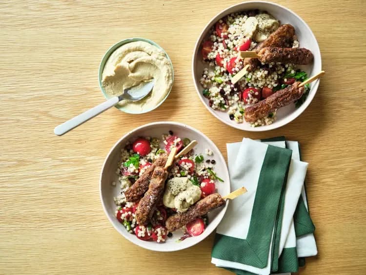 Juicy spiced lamb koftas are grilled until golden and served with a cooling yoghurt dressing for the perfect balance of heat and freshness. Paired with a vibrant Lebanese pearl couscous salad that's packed with crisp cucumber, cherry tomatoes, chickpeas, pickled red onion and a tangy pomegranate-molasses dressing. This dish is a feast of bold flavours and beautiful textures. A wholesome Middle Eastern favourite, made fresh in our kitchen.