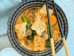 Laksa is a spicy noodle soup originally from Malaysia. It's savoury, tangy and satisfying. This healthy meal is made from a blend of puff tofu, coconut-based Laksa curry paste and fresh vegetables like broccoli, carrots and button mushrooms Laksa is famous for its unique flavour. Its soup is made from coconut milk for the perfect mix of flavour, spice and creaminess. Our plant-based Laksa noodle soup is deliciously healthy and totally plant-based. It's perfect for lunch on a busy day or for dinner with your loved ones. Laksa 是一种源自马来西亚的辣汤面。它味道鲜美、浓郁、令人满意。这种健康的膳食由豆腐花、椰子叻沙咖喱酱和西兰花、胡萝卜和蘑菇等新鲜蔬菜混合而成 叻沙以其独特的风味而闻名。它的汤由椰奶制成,完美融合了风味、香料和奶油味。 我们的纯素叻沙面汤美味健康,完全以植物为基础。它非常适合在忙碌的一天享用午餐或与您所爱的人共进晚餐。