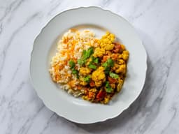Cauliflower Curry [Cauliflower, Crushed Tomato, Carrot, Onion, Brown, Coconut Milk, Ginger (Crushed), Oil, Coconut, Garlic (Crushed), Salt, Sea, Turmeric (Ground), Mustard Seeds, Cumin (Ground), Fennel Seeds, Coriander (Ground), Black pepper, Spices, Cayenne Pepper], Baked Tofu [Tofu, Firm (Soy), Cornflour, Oil, Olive], Ginger Jasmine Rice [Water, Rice, Jasmine, Carrot, Ginger (Crushed), Oil, Coconut, Garlic (Crushed), Salt, Sea]