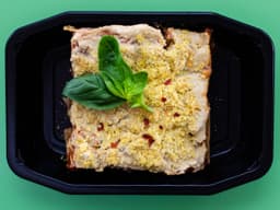 Comes frozen. Microwave from frozen. A vegan take on your favourite classic cheesy lasagne with a vegan mince and tomato sauce, cooked with creamy cheesy bechamel and gluten free lasagne sheets.
