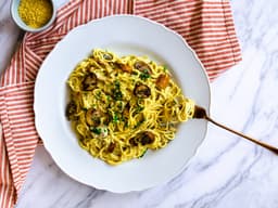 Pasta, Spaghetti (GF), Milk, Soy, Mushrooms, Tofu, Firm (Soy), Nuts, Cashew, Oil, Olive, Tamari (GF) (Soy), Nuttelex Butter, Herbs, Parsley, Maple Syrup, Nutritional yeast, Garlic (Crushed), Paprika, Smoked, Garlic (Ground), Onion (Ground), Salt, Black, Turmeric (Ground), Salt, Sea, Black pepper