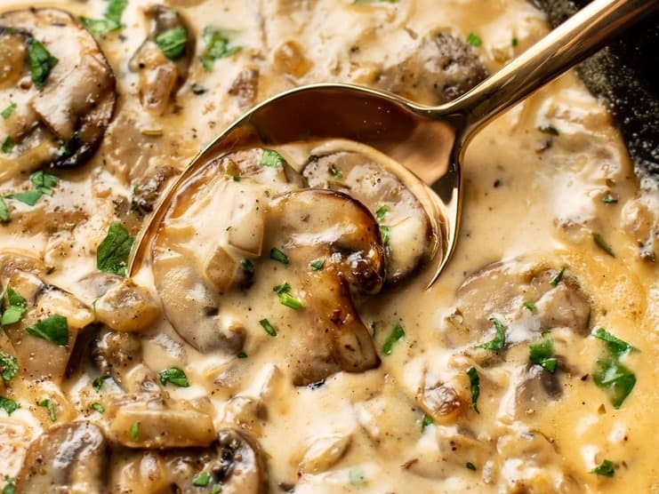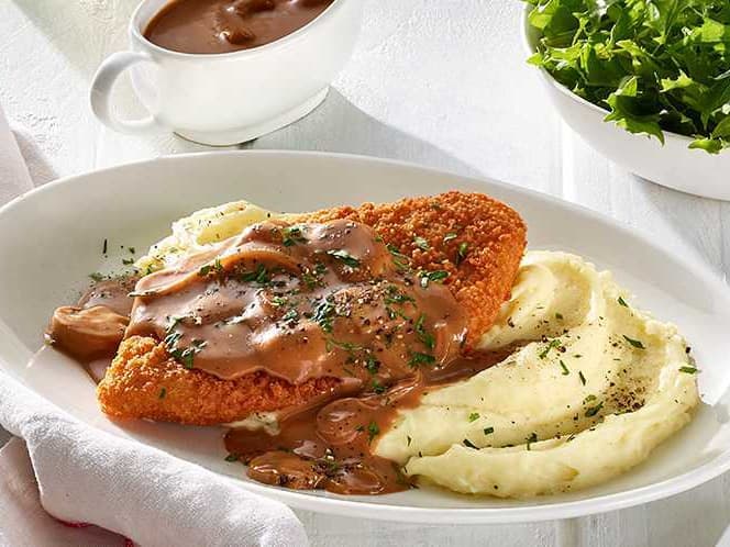 w/ Creamy Mushroom Sauce & Mash Potato This is tender beef crumbed in a delicious panko, lemon and herb breadcrumb served with the perfect sides.