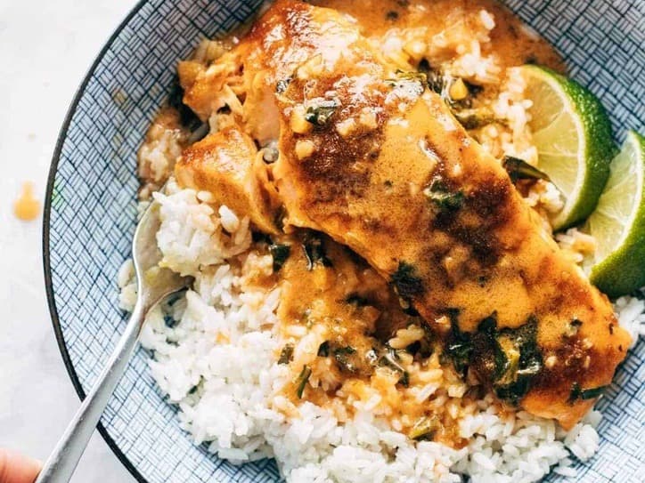 Baked Salmon with a salty-sweet spice rub, Creamy Coconut Curry sauce, and steamy rice to soak it all up. YUM.