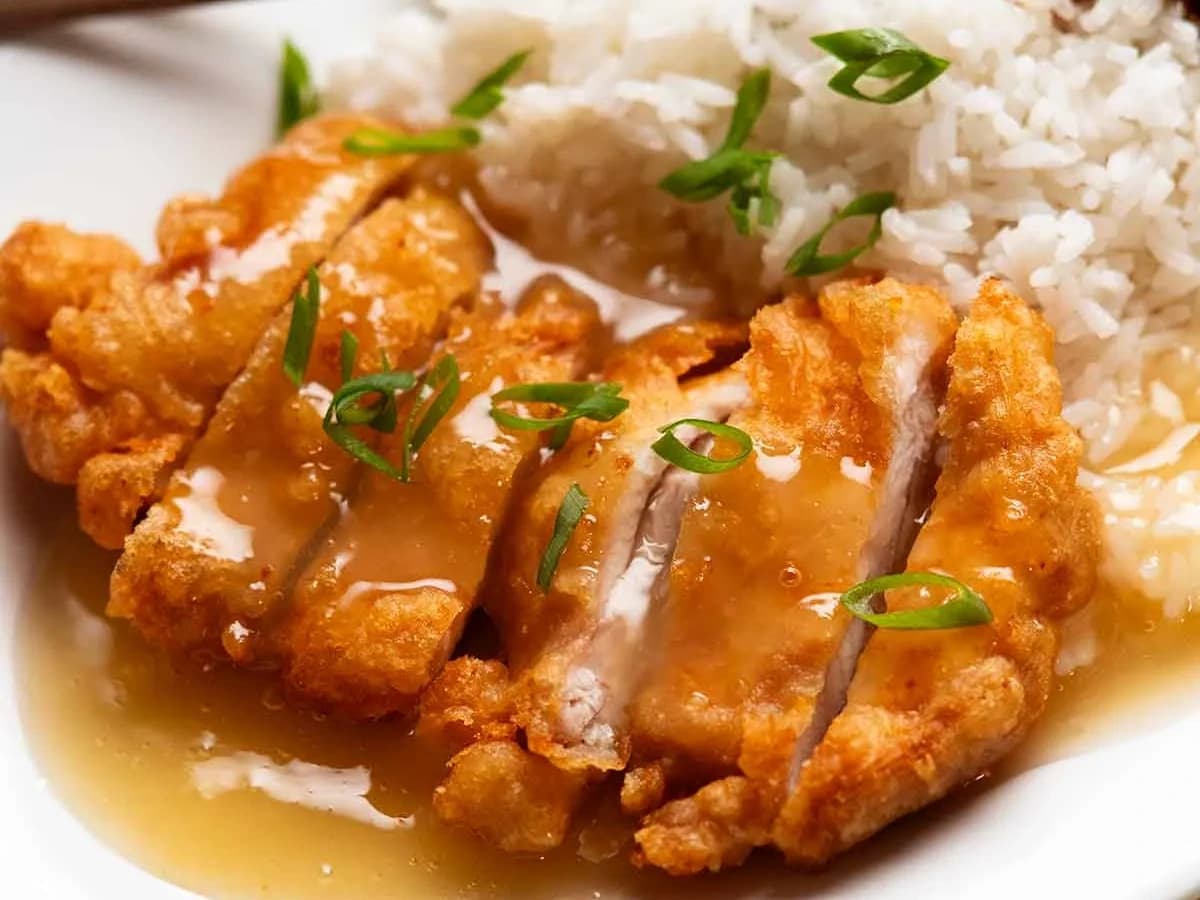 With Spring Onion Fried Rice. Chinese Lemon Chicken the old school way, with a crispy battered cutlet sliced then sauced! You'll love the lemon sauce - brighter flavour and not tooth-achingly sweet like restaurants often are.