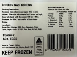 Ginger, Chilli, Garlic, Coriander, Onion, Soy sauce (GF), Capsicum, Corn, Green peas, Brown rice, Free-range eggs, Herbs