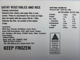 Enjoy this delectable combination of Satay Vegetables & Rice. This dish features a medley of crunchy vegetables coated in a mouthwatering peanut sauce, served atop fluffy white rice. Rest assured, this dish caters to various dietary preferences as it is gluten-free, vegetarian, vegan, dairy-free, and egg-free. It's a tempting choice that will leave you craving more with every bite.