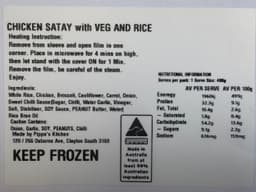 Enjoy this delectable combination of Satay Chicken, Roasted Vegetables & Rice. This dish features a medley of crunchy vegetables coated in a mouthwatering peanut sauce, served atop fluffy white rice. It's a tempting choice that will leave you craving more with every bite.