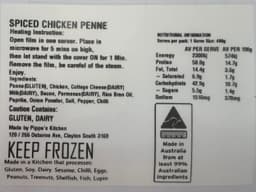 Bacon, Onion powder, Salt, Black pepper, Wheat pasta, Chicken breast, Cottage cheese (Milk), Milk, Parmesan (Milk), Rice bran oil, Paprika, Chilli