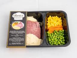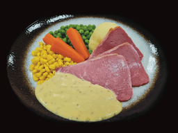 Large, juicy slices of corned beef, creamy mashed potatoes, honey carrots, peas, and corn all topped with our delicious honey mustard sauce.