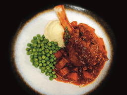 Slow Cooked Lamb Shank in Red wine & Tomato w/ Mash & Peas