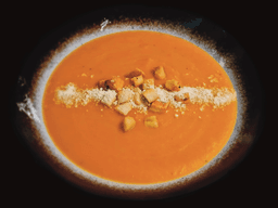 Cream (Milk), Pumpkin, Potatoes, Carrots, Onion, Leek, Cumin, Olive oil, Water, Parmesan (Milk), Salt, Pepper