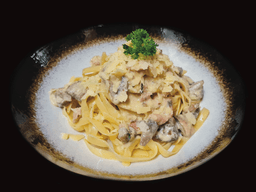 Chicken and Mushroom Carbonara Al dente fettuccine tossed in a creamy egg and bacon sauce. Hearty and filling, this will not only satiate your appetite but leave you wanting more.