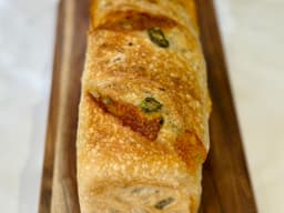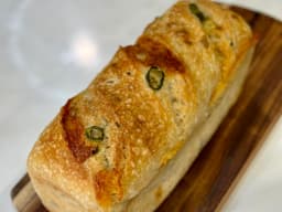 A flavourful twist on traditional sourdough. This loaf is infused with spicy pickled jalapeños and cheddar cheese. Ideal for paring with soups, accompanying a cheese & meat platter, toasted sandwich or just lathered in butter and eaten fresh baked in a sandwich loaf for easy slicing and a softer loaf.