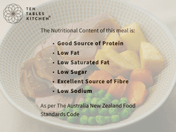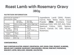 Lamb, Roast potato, Roasted rings carrots, Peas, Rosemary Gravy [Water, Reserved stock (Lamb, Beef, or Chicken), Gravy powder (Milk, Sulphites), Starch, Rosemary], Canola oil, Salt, Paprika