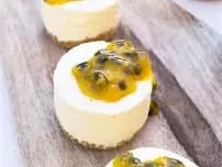 A buttery biscuit base with cheecake topping and passionfruit coulis