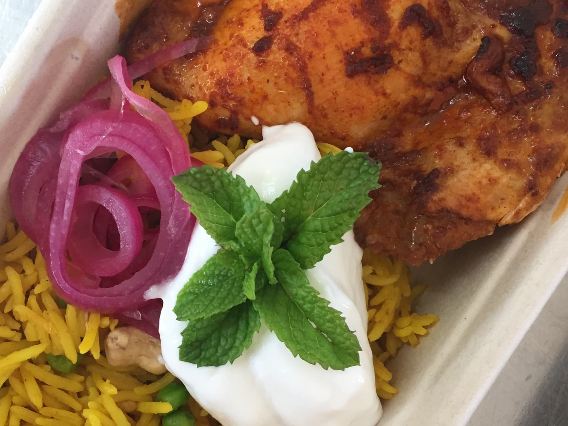 Free Range Chicken marinated with a huge array of spices. Oven baked till succulent. Sided with a cooling coconut and mint yoghurt and Indian rice. So easy to reheat for a quick and healthy dinner.