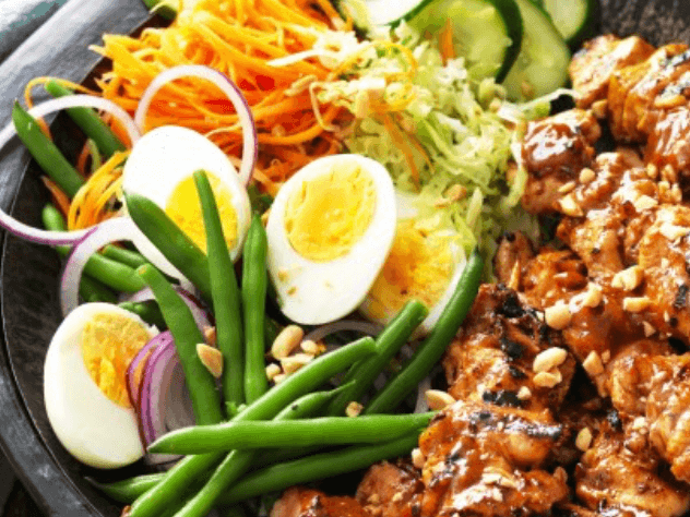 Aisha Nanor Martin's spicy Indonesian salad has it all; crunchy vegetables, boiled eggs, chilli peanut sauce, fresh coriander and a sprinkling of toasted peanuts for added crunch. It is perfectly matched with our Chicken Satay for a complete feast. Yum Yum Yum!