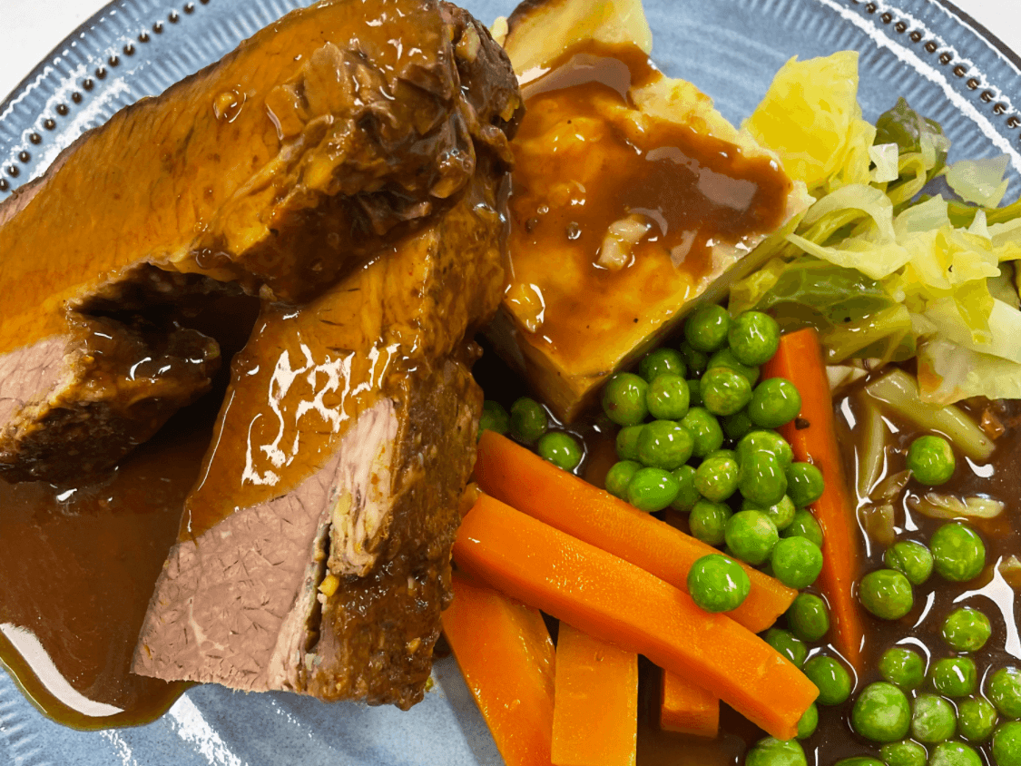 Beefy Brisket of Grass-fed Beef with Smoky Paprika Rub cooked for 12 hours till fall-apart and juicy. A delicious roast served with seasonal vegetables and covered in beefy gravy. Meltingly good and high in protein!