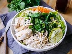 A fresh and super healthy salad. A perfectly cooked fillet of free range chicken, glazed with an umami hit of ginger, lime, tamari and yellow miso. On a bed of vermicelli rice noodles loaded with crunchy vegetables, fresh herbs and a spicy peanut sauce. A super low carb, low fat and high protein salad. Or enjoy it warmed though! It's up to you!!
