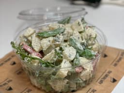 Potato, Radish, Peas, Fennel, Mayonnaise (Egg), Rocket, Chives, Mint, Lemon juice, Anchovy (Fish), Garlic, Mustard (Milk), Greek yoghurt (Milk), Tarragon
