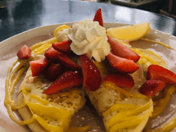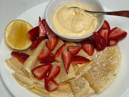 Our crepes are the perfect dessert for any occasion - they're light, fluffy, and delicious. Topped with strawberries and lemon curd cream, these treats are sure to satisfy your sweet tooth. Add lemon curd or lemon juice for an extra zing. 3 crepes per serve.