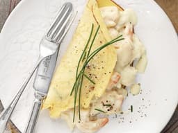 Place the mornay on half of the crepe and fold the crepe over the top. Serving suggestion: add chives and a wedge of lemon. ENJOY!!