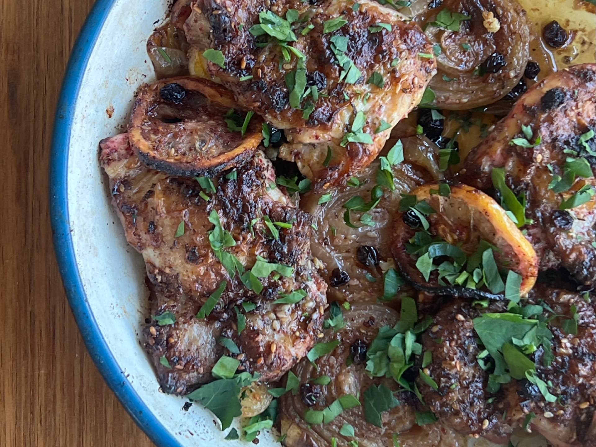 Succulent organic chicken marinated with garlic, lemon, za’atar, and warm spices, then roasted along with currants until golden and fragrant. This vibrant dish balances savoury depth with bright citrus, a perfect pair with our Crispy Za'atar Roast potatoes and for sharing around the table.