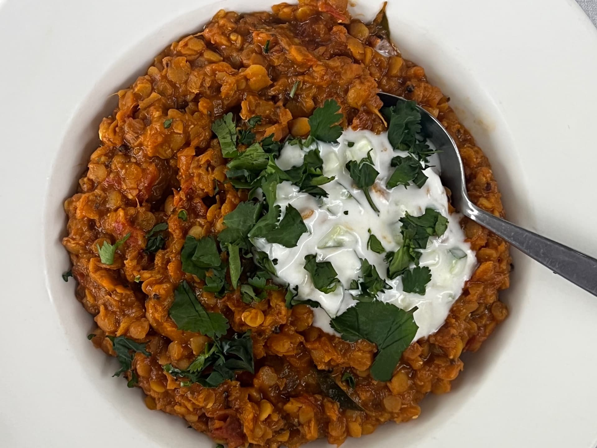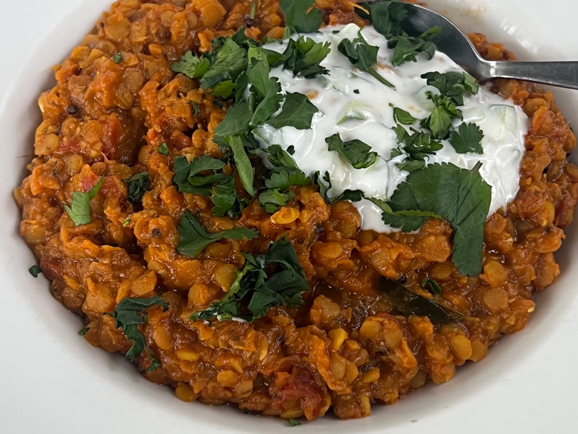 A mild, comforting, aromatic bowl of red lentils gently simmered with mustard seeds, cumin, turmeric, tomatoes with fresh coriander and curry leaves. Finished with lime and a cooling cucumber coconut yoghurt, this dish balances warmth and brightness in every bite. A vibrant twist on classic dhal, hearty, nourishing, and perfect for a standalone lunch or on top of rice. (Coconut yoghurt).
