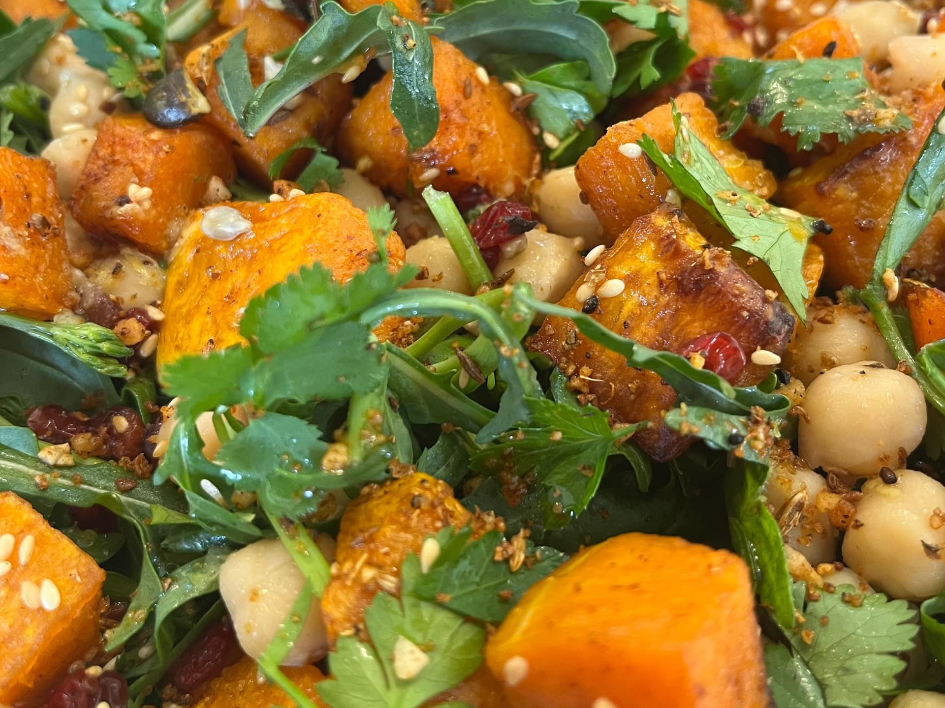 This gorgeous savoury salad is far more than the sum of its parts. The chickpeas and spiced roasted pumpkin give it enough depth to be a meal in and of itself, while four different leafy greens brighten it up. The (incredible) macadamia dukkah and toasted seeds are rich and savoury wile the barberries bring enough acidity to balance the whole thing out. If you'd like to serve this as part of a spread, it would go wonderfully with our seedy quinoa bread, za'atar chicken or crispy potatoes.