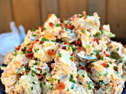 Delicious creamy potato salad with crispy bacon, onion & garlic. You will want more!