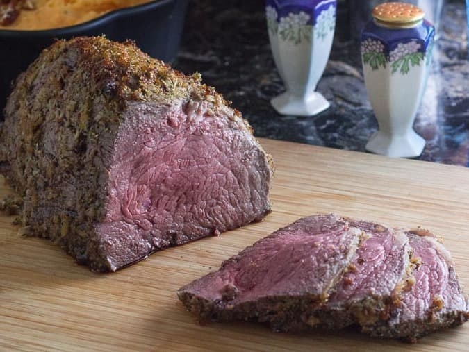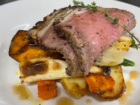 Medium rare cooked roast beef in a zesty horseradish crust. Served with a medley of sweet roasted vegetables and a rich gravy reduction... You won't want Christmas to end!