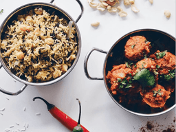 Potatoes, Basmati rice, Chickpeas, Carrots, Cauliflower, Wild rice, Cashew nuts, Chickpea flour, Coriander, Chilli, Garlic, Ginger, Rice bran oil, Garam masala, Pink salt