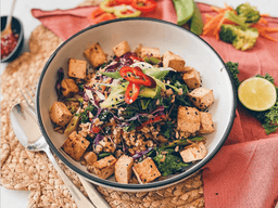 Tofu (Soy), Brown rice, Garlic, Ginger, Broccoli, Carrots, Beans, Soy sauce (GF), Sambal soy, Onion, Red cabbage, Sesame oil, Kale, Zucchini, Capsicum, Sambal oelek (Sulphites)