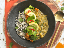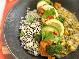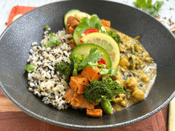 Coconut milk, Vegetable stock (GF), Brown rice, Sweet potato, Crushed tomato, Cinnamon quills, Broccoli florets, Chickpeas, Mung beans, Onion, Garlic, Ginger, Broccoli, Pumpkin, Zucchini, Red split peas, Spinach, Black quinoa, Curry powder, Rice bran oil, Cumin seeds, Pink salt, Curry leaf